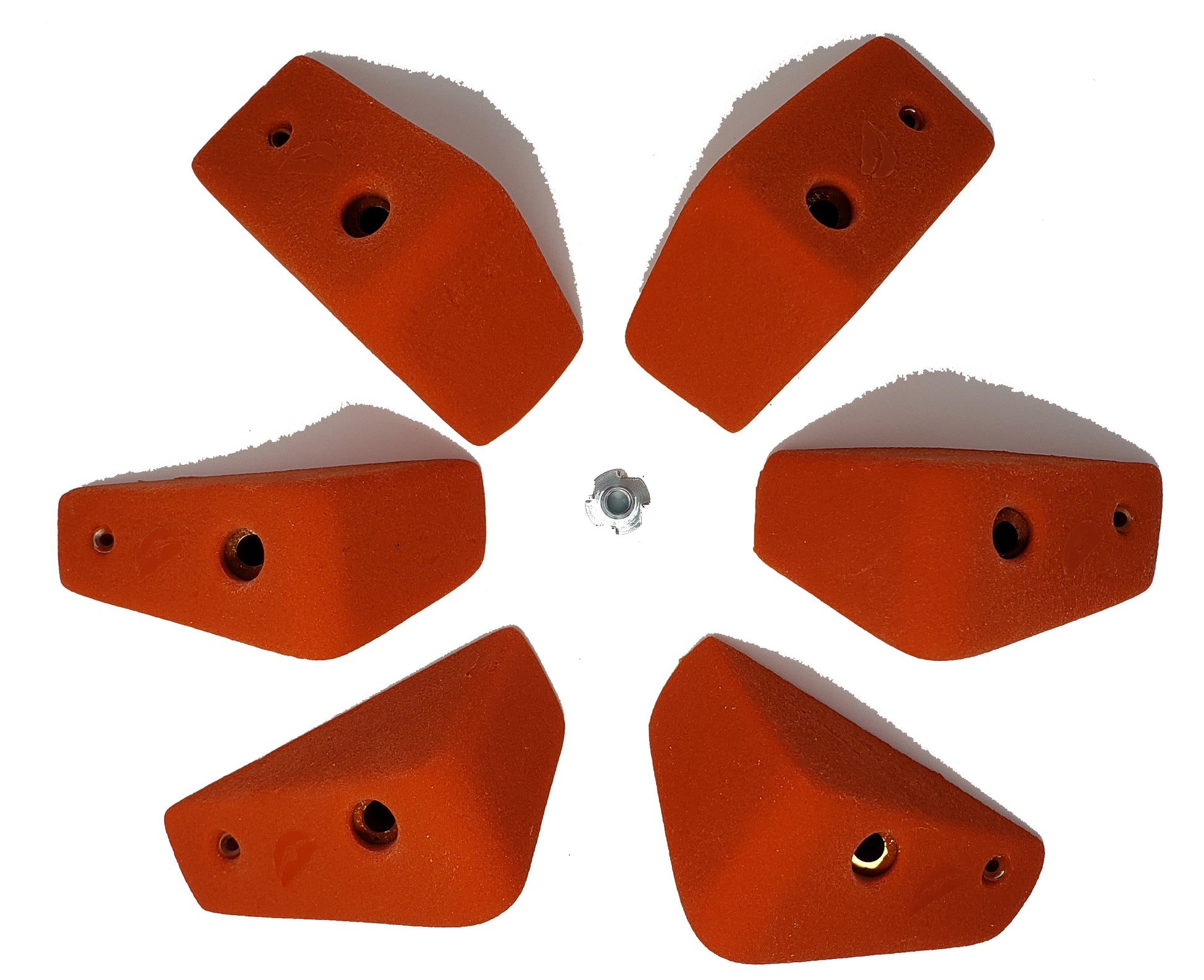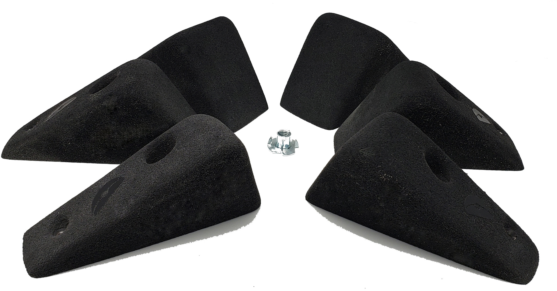 - Six symmetrical, full-handed, polyurethane pinches for vertical to over-hanging walls. Type of hold may very with positioning.